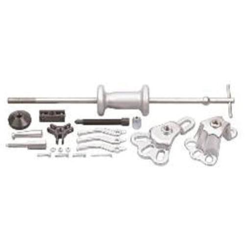 - Includes: shallow flange, deep flange, 3-way yoke, center bolt and cone, 3-piece adapter set, 24" slide hammer, blow mold case for storage