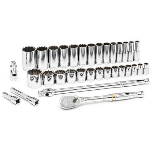 1/2" Drive Universal Joint, 1/2" Drive 12 Point Standard SAE Socket 1-1/2", 1/2" Drive 12 Point Standard SAE Socket 7/16", 1/2" Drive 12 Point Standard SAE Socket 1/2", 1/2" Drive 12 Point Standard SAE Socket 9/16", 1/2" Drive 12 Point Standard SAE Socket 5/8", 1/2" Drive 12 Point Standard SAE Socket 11/16", 1/2" Drive 12 Point Standard SAE Socket 3/4", 1/2" Drive 12 Point Standard SAE Socket 13/16", 1/2" Drive 12 Point Standard SAE Socket 7/8", 1/2" Drive 12 Point Standard SAE Socket 15/16", 1/2" Drive 12 Point Standard SAE Socket 1", 1/2" Drive 12 Point Standard SAE Socket 1-1/16", 1/2" Drive 12 Point Standard SAE Socket 1-1/8", 1/2" Drive 12 Point Deep SAE Socket 7/16", 1/2" Drive 12 Point Deep SAE Socket 1/2", 1/2" Drive 12 Point Deep SAE Socket 9/16", 1/2" Drive 12 Point Deep SAE Socket 5/8", 1/2" Drive 12 Point Deep SAE Socket 11/16", 1/2" Drive 12 Point Deep SAE Socket 3/4", 1/2" Drive 12 Point Deep SAE Socket 13/16", 1/2" Drive 12 Point Deep SAE Socket 7/8", 1/2" Drive 12 Point Deep SAE Socket 15/16", 1/2" Drive 12 Point Standard SAE Socket 1-1/4", 1/2" Drive 12 Point Deep SAE Socket 1", 1/2" Drive 12 Point Deep SAE Socket 1-1/16", 1/2" Drive 12 Point Deep SAE Socket 1-1/8", 1/2" Drive 12 Point Deep SAE Socket 1-1/4", 1/2" Drive Flex Handle/Breaker Bar 15", 1/2" Drive Extension 3", 1/2" Drive Extension 5", 1/2" Drive 12 Point Deep SAE Socket 1-1/2", 1/2" Drive 90-Tooth Teardrop Ratchet 11"
