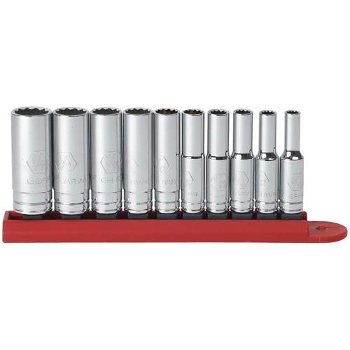 1/4" Drive 12 Point Deep SAE Socket 3/16", 1/4" Drive 12 Point Deep SAE Socket 7/32", 1/4" Drive 12 Point Deep SAE Socket 1/4", 1/4" Drive 12 Point Deep SAE Socket 5/16", 1/4" Drive 12 Point Deep SAE Socket 11/32", 1/4" Drive 12 Point Deep SAE Socket 3/8", 1/4" Drive 12 Point Deep SAE Socket 7/16", 1/4" Drive 12 Point Deep SAE Socket 1/2", 1/4" Drive 12 Point Deep SAE Socket 9/16", 1/4" Drive 12 Point Deep SAE Socket 9/32"