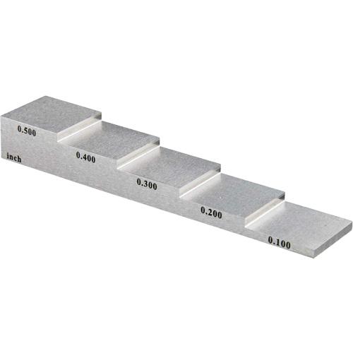 This steel calibration block features 5 steps with imperial and metric markings and can be used to calibrate and verify ultrasonic thickness gauges