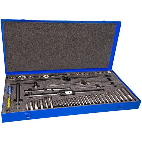 533 Maintenance Hand Tap & Die Set – 52, #4-40 NC Tap; #6-32 NC Tap; #8-32 NC Tap; #10-24 NC Tap; #10-32 NF Tap; #12-24 NC Tap; 1/4-20 NC Tap; 1/4-28 NF Tap; 5/16-18 NC Tap; 5/16-24 NF Tap; 3/8-16 NC Tap; 3/8-24 NF Tap; 7/16-14 NC Tap; 7/16-20 NF Tap; 1/2-13 NC Tap; 1/2-20 NF Tap; 9/16-12 NC Tap; 9/16-18 NF Tap; 5/8-18 NF Tap; 3/4-16 NF Tap; 7/8-14 NF Tap; 1-14 NS Tap; 1/8-27 NPT Tap; 1/4-18 NPT Tap; 3/8-18 NPT Tap; 1/2-14 NPT Tap; M14x1.5 Tap; M18x1.5 Tap; #4-40 NC Die; #6-32 NC Die; #8-32 NC Die; #10-24 NC Die; #10-32 NF Die; #12-24 NC Die; 1/4-20 NC Die; 1/4-28 NF Die; 5/16-18 NC Die; 5/16-24 NF Die; 3/8-16 NC Die; 3/8-24 NF Die; 7/16-14 NC Die; 7/16-20 NF Die; 1/2-13 NC Die; 1/2-20 NF Die; 9/16-18 NF Die; 5/8-18 NF Die; 3/4-16 NF Die; 7/8-14 NF Die; 1-14 NS Die; 1/8-27 NPT Die; 1/4-18 NPT Die; 3/8-18 NPT Die; 1/2-14 NPT Die; M14x1.5 Die; M18x1.5 Die; Metal Case