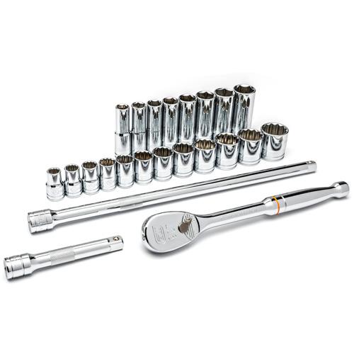 1/2" Drive 6 Point Standard SAE Socket 7/16", 1/2" Drive 6 Point Standard SAE Socket 1/2", 1/2" Drive 6 Point Standard SAE Socket 9/16", 1/2" Drive 6 Point Standard SAE Socket 5/8", 1/2" Drive 6 Point Standard SAE Socket 11/16", 1/2" Drive 6 Point Standard SAE Socket 3/4", 1/2" Drive 6 Point Standard SAE Socket 13/16", 1/2" Drive 6 Point Standard SAE Socket 7/8", 1/2" Drive 6 Point Standard SAE Socket 15/16", 1/2" Drive 6 Point Standard SAE Socket 1", 1/2" Drive 6 Point Standard SAE Socket 1-1/16", 1/2" Drive 6 Point Standard SAE Socket 1-1/8", 1/2" Drive 6 Point Deep SAE Socket 1/2", 1/2" Drive 6 Point Deep SAE Socket 9/16", 1/2" Drive 6 Point Deep SAE Socket 5/8", 1/2" Drive 6 Point Deep SAE Socket 11/16", 1/2" Drive 6 Point Deep SAE Socket 3/4", 1/2" Drive 6 Point Deep SAE Socket 13/16", 1/2" Drive 6 Point Deep SAE Socket 7/8", 1/2" Drive 6 Point Deep SAE Socket 15/16", 1/2" Drive Extension 5", 1/2" Drive Extension 15", 1/2" Drive 90-Tooth Teardrop Ratchet 11"