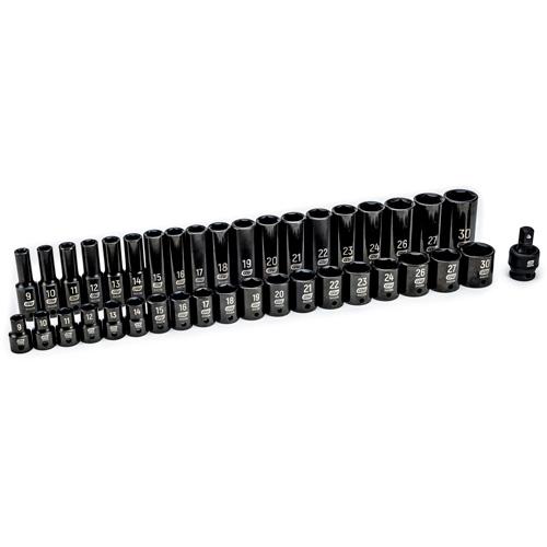 6-Point Standard & Deep Impact Metric Socket Set – 1/2″, Impact, Deep/Standard, 39, (1) 1/2″ Drive Impact Universal Joint; (38) Assortment of Sockets, 9mm, 10mm, 11mm, 12mm, 13mm, 14mm, 15mm, 16mm
