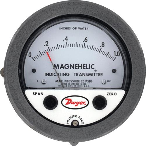• Easy-to-read dial gauge is complimented by the two-wire, 4-20 mA control signal utilizing the time-proven Dwyer® Magnehelic® gauge mechanical design and Series 600 transmitter technology