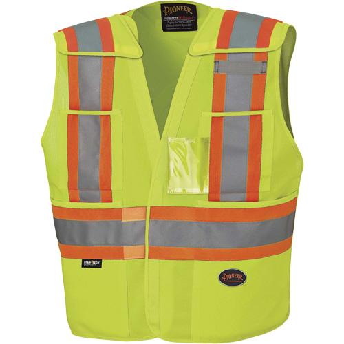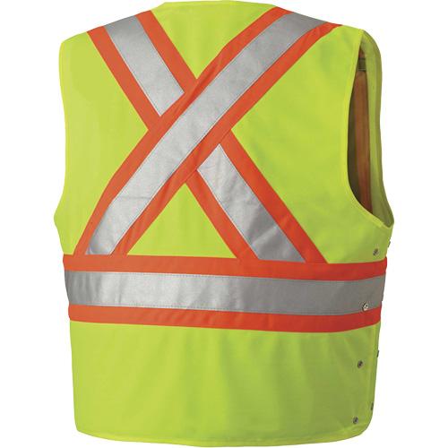 - 5 point tear-away, brass snap front, chest pocket with reflective hook and loop closure on the left, chest pocket on the right, mid pocket with 2 pen slots on the left, 2 lower pockets with flaps, 2 radiophone clip straps, and 2 inside pockets