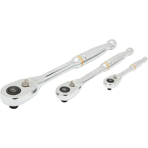 - Features 1/4", 3/8", 1/2" drive ratchets packed in a durable tray