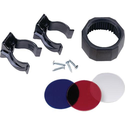 - Content: Rubber anti-roll device/lens holder; red, clear and blue lenses; two mounting brackets