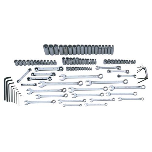 • Includes: 12PC 1/4" Dr. Socket Set, 11PC 3/8" Dr. Socket Set, 12PC 3/8" Dr. Deep Socket Set, 12PC 1/2" Dr. Socket Set, 18PC 1/2" Dr. Deep Socket Set, 9PC S2 Long Arm Hex Set, 7PC S2 Short Folding Hex Set, 3PC Metric Flare Nut Wrench Set, 15PC Metric Combination Wrench Set and 5PC Metric Ratcheting Wrench Set