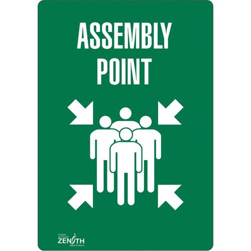 “Assembly Point” Sign – Vinyl, Plastic, Aluminum, 14″, 10″, Adhesive, English with Pictogram, Fire and Emergency, Assembly Point w/Pictogram, 4 Mil, 1 Year Limited