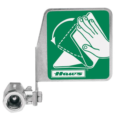 Stainless steel push flag that operates a stay-open chrome-plated brass ball eyewash valve