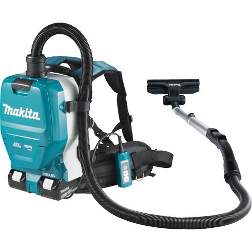 - Includes: (2) 18V (5.0 Ah) Li-Ion batteries, (1) Dual port rapid charger, (1) Battery cover, (1) HEPA filter, (1) 1-1/8" X 3' Hose, (1) Hose band, (1) Bent pipe, (1) Flexible rubber nozzle, (1) Floor nozzle, (1) Telescopic pipe, (1) Paper filter bag, (1) Backpack shoulder harness