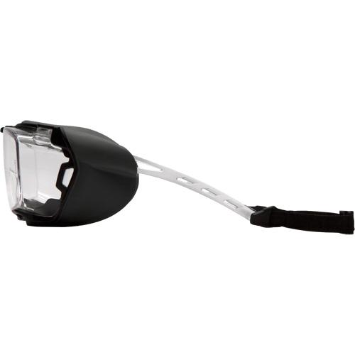 - Temples extend from brow bar to avoid interference with prescription frame's temples