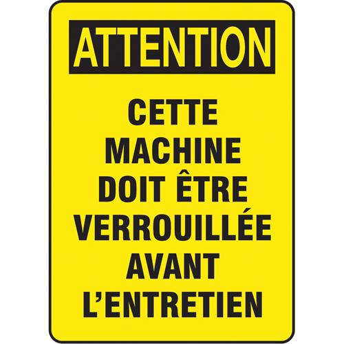 “Cette machine doit être verrouillée” Sign – Aluminum, Plastic, Vinyl, 14″, 10″, Bolt-On, French, Equipment, Attention; Cette Machine Doit être Verrouillée Avant L’entretien, ‘-20°F to 140°F