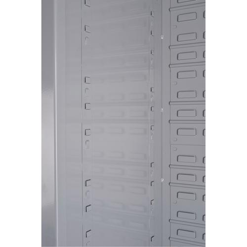 - Incorporates louvered bin hanging panels welded to the cabinet's back and doors ;