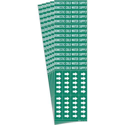 “Domestic Cold Water Supply” Pipe Markers – Vinyl, White on Green, 0″ – 3/4″, 2-1/4″, 2-3/4″, 1/2″, English, Self-Adhesive, 3