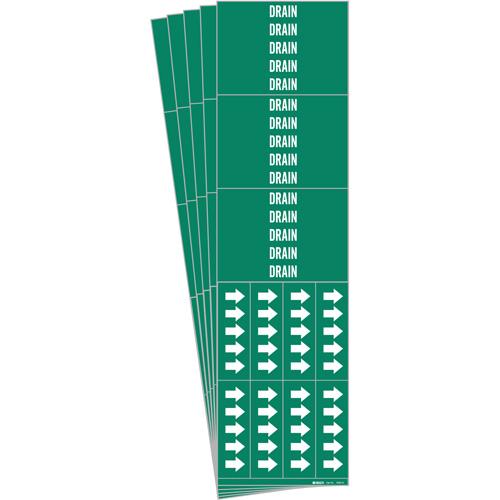 “Drain” Pipe Markers – Vinyl, White on Green, 0″ – 3/4″, 2-1/4″, 2-3/4″, 1/2″, English, Self-Adhesive, 3