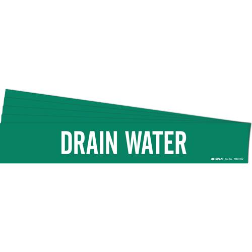 “Drain Water” Pipe Marker – Vinyl, White on Green, 8″ – 20″, 4″, 24″, 3-1/2″, English, Self-Adhesive