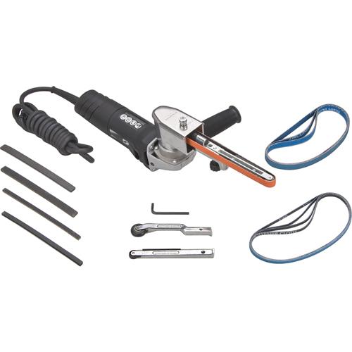 - Includes model TGY744 electric Dynafile® II with model THZ341 contact arm and two additional arms models THZ340 and THZ342, eight abrasive belts of various grits and an assortment of platen pads