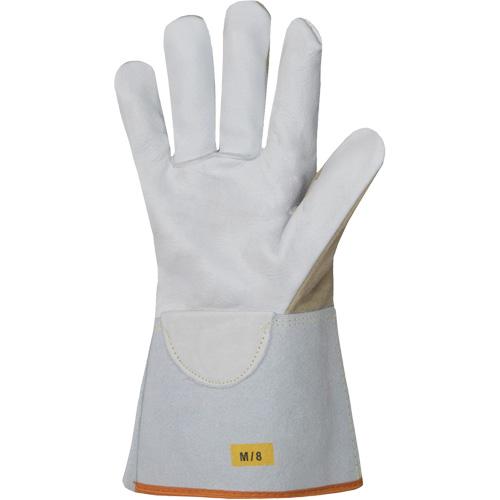 - One-piece, brown,extra-durable, split cowhide backs and white, grain horsehide palms