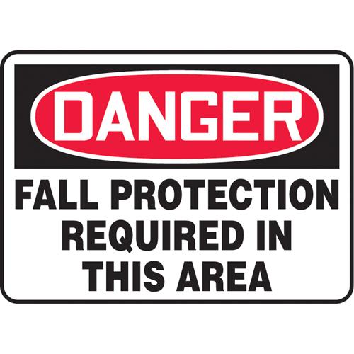 “Fall Protection Required” Sign – Vinyl, Plastic, Aluminum, 7″, 10″, Adhesive, English, Personal Protection, Danger; Fall Protection Required In This Area, ‘-20°F to 140°F, 2 years outdoors
