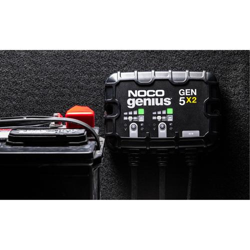- A two-bank onboard battery charger rated at 10-amps (5-amps per bank) for 12-volt batteries, including marine, boat, starter, and deep-cycle batteries