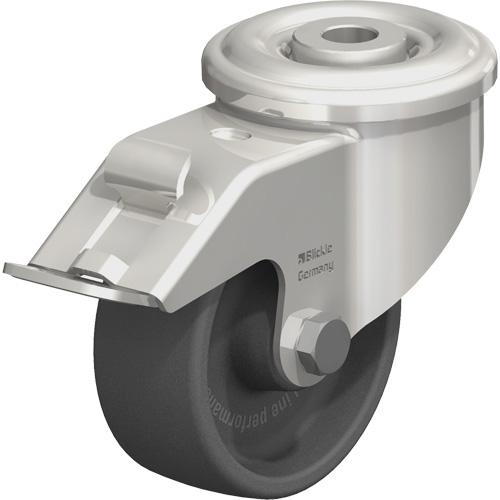 - Heat-resistant stainless steel swivel caster with bolt hole fitting and 'stop-fix' brake