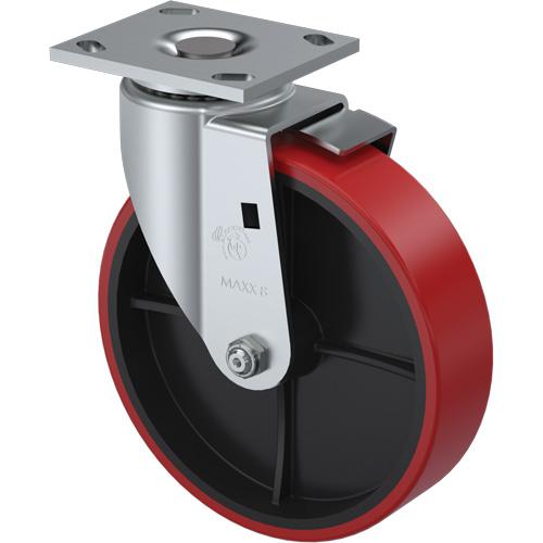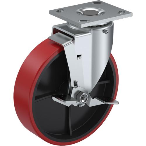 Heavy-Duty EMaxx Kingpin Caster – 8″ (203.2 mm), 900 lbs. (408 kg.), Mold-on Urethane, Swivel with Brake, Steel, 2″ (50.8 mm), 2-5/8″ – 3″ (67 mm x 76 mm) – 3″ – 3-5/8″ (76 mm – 92 mm), 3/8″ (9.52 mm)