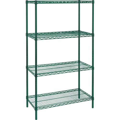 Heavy-Duty Green Epoxy Finish Wire Shelving – Starter, 800 lbs., 2000 lbs., 4, 36″, 48″, 60″, 72″, 18″, 63″, Evenly distributed weight, 1 Year Limited