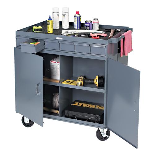 - Back side consists of a 4-compartment lockable utility cabinet and a 6-drawer cabinet