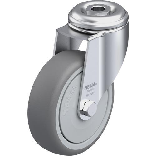High-Quality Thermoplastic Elastomer Caster – 4″ (102 mm), 240 lbs. (108 kg.), Thermoplastic Rubber-Elastomer, Swivel, Steel, 1-1/4″ (31.8 mm), Bolt Hole Fitting, 1/2″ (13 mm), 0″ (0 mm), 85° Shore A, Ball Bearing