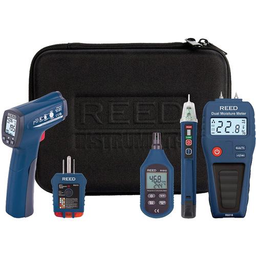 - Includes: Infrared Thermometer (R2300), Dual Moisture Meter (R6018), Non-Contact Voltage Detector (R5110), Receptacle Tester (R5210), Temperature & Humidity Meter (R1910), Carrying Case (R9940)