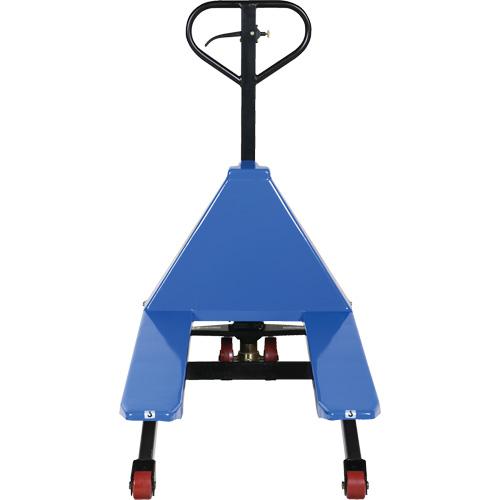 - Features a 12V battery, an integral battery charger, battery level gauge, and an adjustable lowering speed
