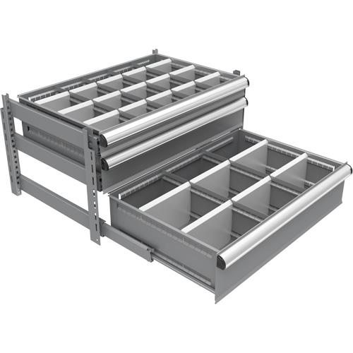 - Features (1) 4" high drawer with 20 compartments, (1) 6" drawer with 12 compartments, (1) 8" drawer with 9 compartments