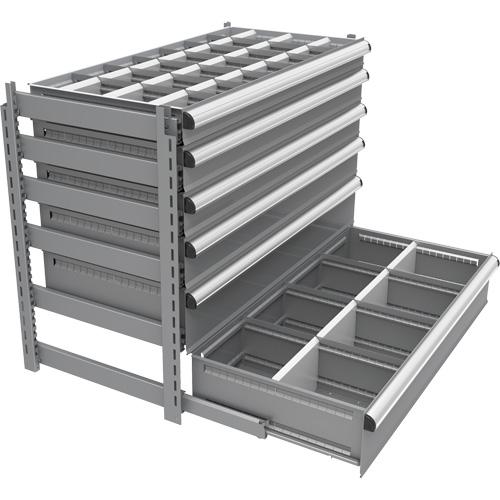 - Features (1) 4" drawer with 28 compartments, (2) 5" drawers, 16 compartments, (1) 6" drawer with 16 compartments, (2) 8" drawer with 8 compartments