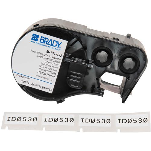 - Matte white polyester material has a permanent acrylic adhesive and is thermal transfer printable