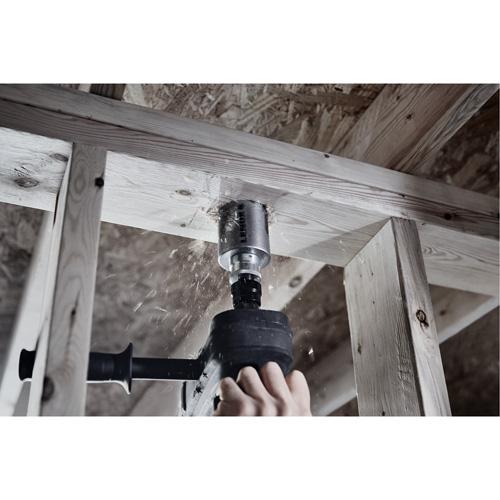 - Large carbides and aggressive tooth design cuts through material faster for rough-in applications