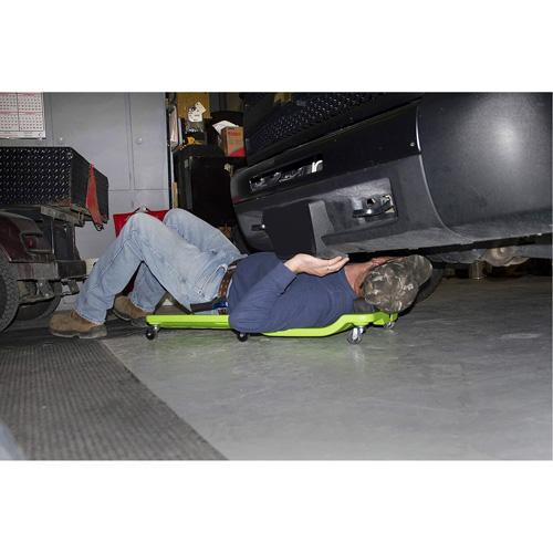 Neon Green Low Profile Plastic Creeper – Fixed, 6, 300 lbs., 38″, 17-1/2″, Neon Green Creeper; 2″ Pop-in Wheel; 2″ Pop-in Wheel for Plastic Creepers 6 Pack; Replacement Headrest, 4″