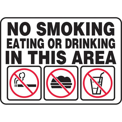 “No Smoking, Eating, Or Drinking” Sign – Vinyl, 7″, 10″, Adhesive, English with Pictogram, Housekeeping and Hygiene/Smoking Control, No Smoking Eating or Drinking In This Area w/Pictogram
