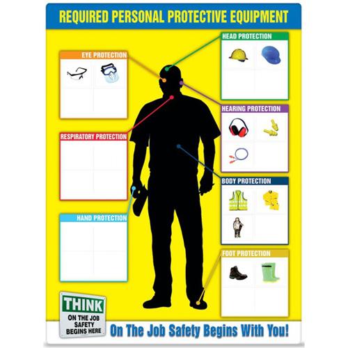 - Template chart measuring 24" x 18" with blank spaces provided, that is filled by placing PPE product pictorials from the included label booklet