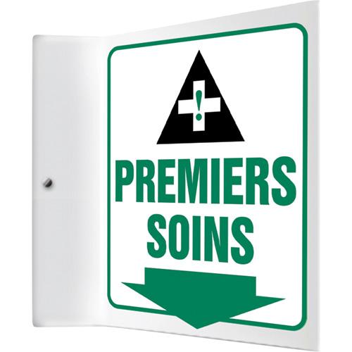 “Premiers soins” Projection™ Sign – Plastic, 8″, 8″, Bolt-On, French with Pictogram, First Aid, 90°, Premiers Soins w/Pictogram and Downward Arrow, 1-1/2″