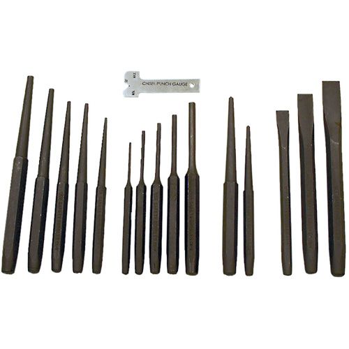 Punch & Chisel Set – 16, Centre Punch 1/8″ x 5″, 3/16″ x 6″; Cold Chisels 3/8″ x 5-1/2″, 1/2″ x 6″, 5/8″ x 6-1/2″; Pin Punch 3/32″ x 4-1/4″, 1/8″ x 4-3/4″, 5/32″ x 5-1/4″, 3/16″ x 5-1/4″, 1/4″ x 5-3/4″; Taper Punch 3/32″ x 5-1/4″
