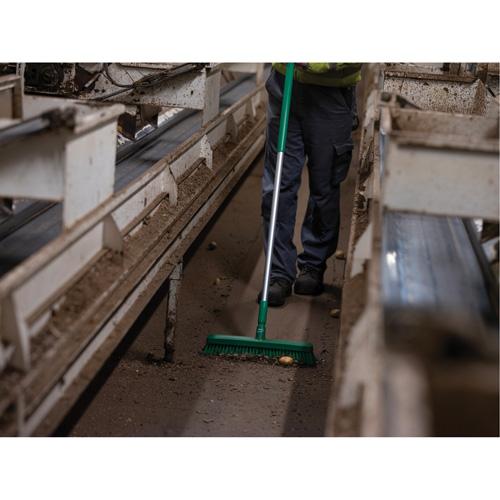 - The angle cut of the bristles also helps prevent skipping or hopping during long pushes across production flooring