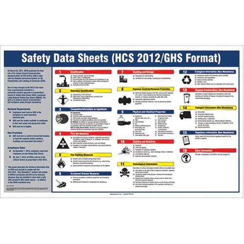 - Display poster shows employees what information must be included in the new regulation Safety Data sheets (SDS) to comply with OSHA and GHS requirements