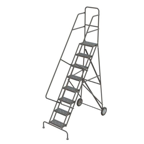 - Two 10" diameter semi-pneumatic wheels on rear of ladder, reinforced rubber tips on front legs to secure ladder during use