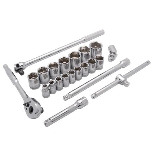 - Contains: 3/8, 7/16, 1/2, 9/16, 5/8, 11/16, 3/4, 13/16, 7/8, 15/16, 1, 1-1/16, 1-1/8, 1-3/16, 1-1/4, 1-5/16, 5 & 10 Extensions, 45 Tooth Ratchet, Universal Joint, Flex Handle, T-handle