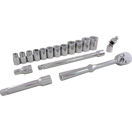 - Includes: 7/16", 1/2", 9/16", 5/8", 11/16", 3/4", 13/16", 7/8", 15/16", 1", 11/16", 11/8", Reversible ratchet, Flex handle, U-joint, 5" Extension, 10" Extension, Metal box # 9101, Socket rail