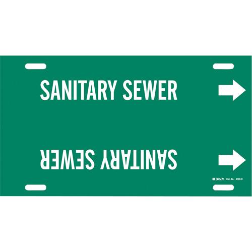 “Sanitary Sewer” Pipe Marker – Plastic, White on Green, 10″ – 15″, 10″, 32″, 3-1/2″, English, Strap-On