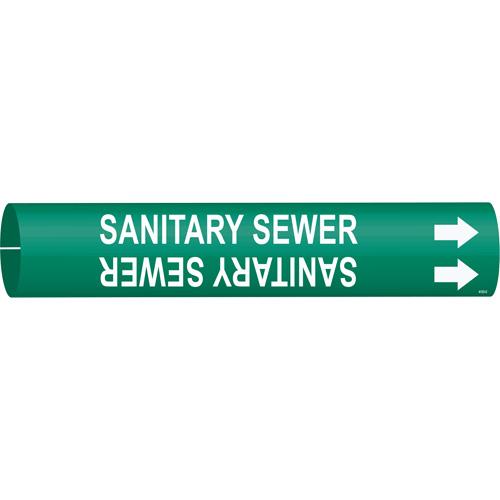 “Sanitary Sewer” Pipe Marker – Plastic, White on Green, 2-1/2″ – 3-7/8″, 2″, 2″, 1-1/4″, English, Snap-On