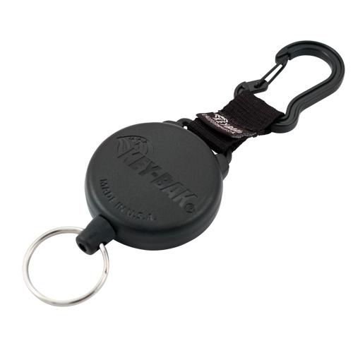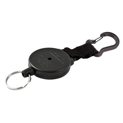 - Heavy-duty retractable carabiner holder that conveniently attaches to variety of different objects