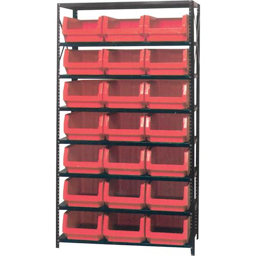 Shelving Unit with Stacking Bins – Starter, 8, 650 lbs., Steel, 42″, 18″, 76″, Boltless, Open, 21, Red, 12-3/8″ W x 19-3/4″ D x 7-7/8″ H, Grey Enamel